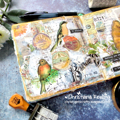 The two stars of the show were the phonograph, which I cut from the Stamperia Lady Vagabond Lifestyle 6x6 paper pad and the birds, which I added using the Tim Holtz Ideology Aviary Collage Paper and some Clear Gesso. I also embellished the edges with Inka Gold and finished with a title using Tim Holtz Ideology Small Talk Stickers.