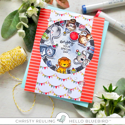 Hey friends, today I've got a fun and festive birthday card to share using Hello Bluebird's Word Buddies Jungle. I love these cute little critters so much! I added in some additional images from Word Buddies Woodland and Cake Time and even a little gift from Christmas is Coming. I colored all the images with Copic markers to match some patterned paper from the Carta Bella Here, There, and Everywhere 6x6 and trimmed them out with their matching dies.